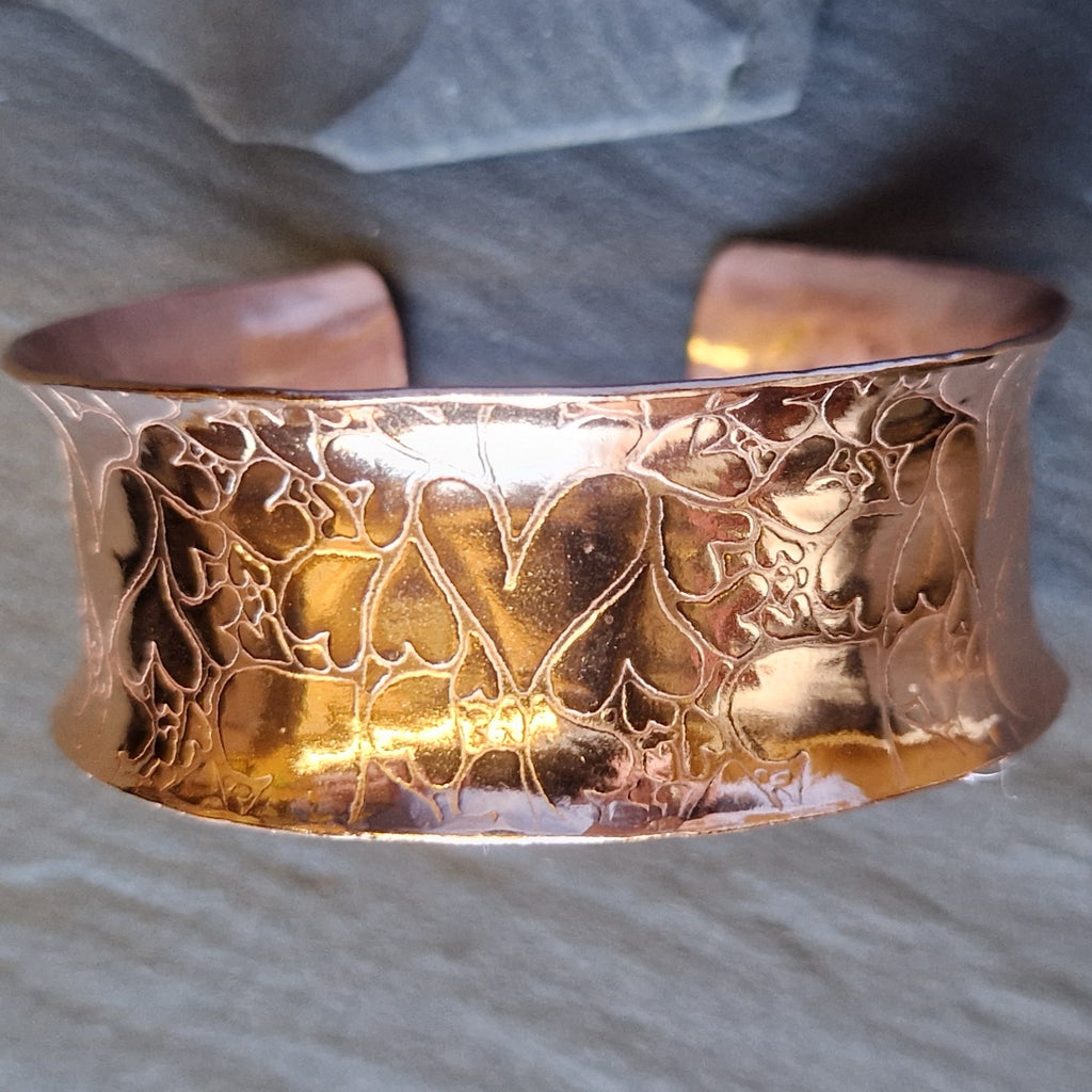 I have created this copper cuff bangle from copper sheet which I have embossed with an abstract heart design.