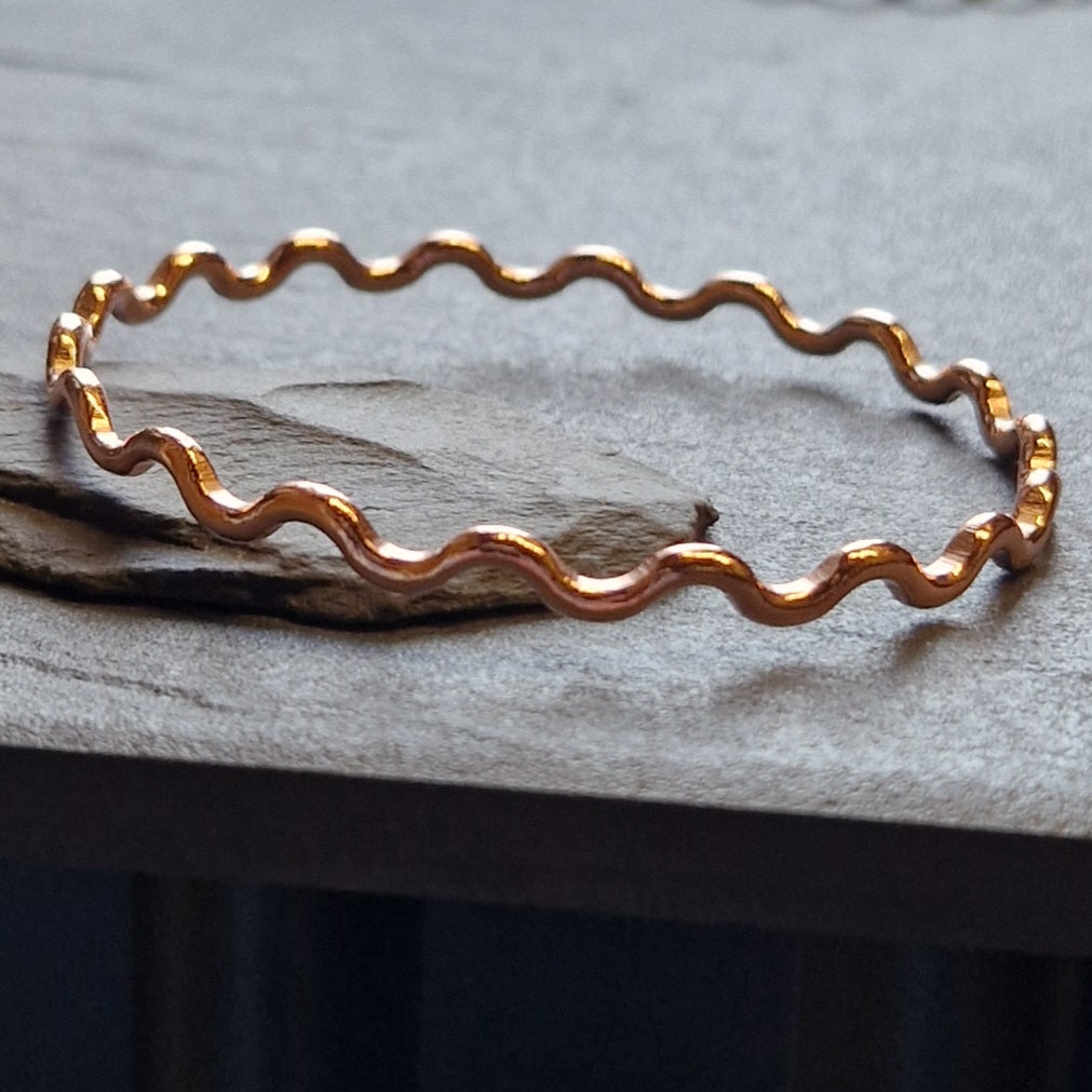 I have hand forged this bangle from copper wire and used a bangle die to form a wave shape.
