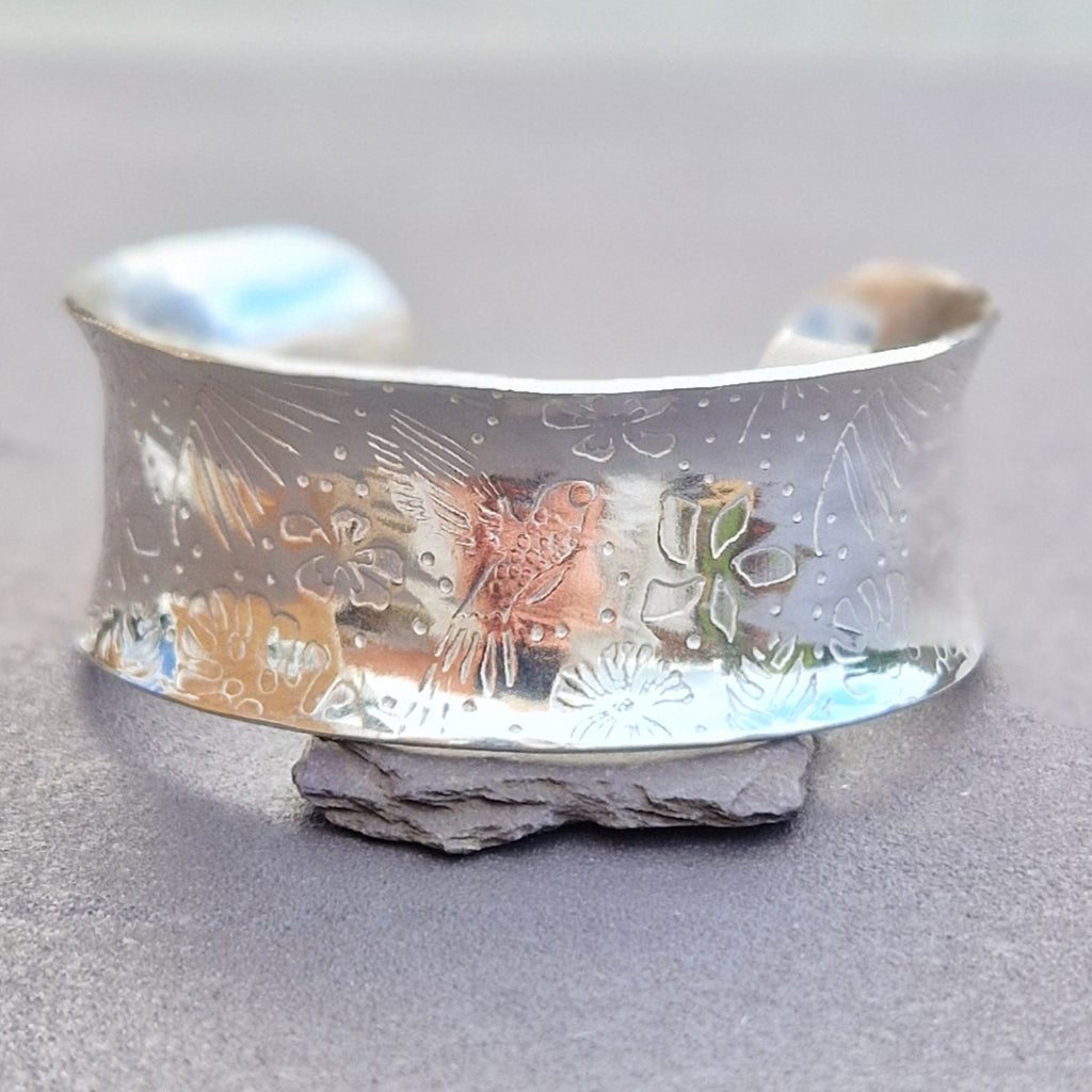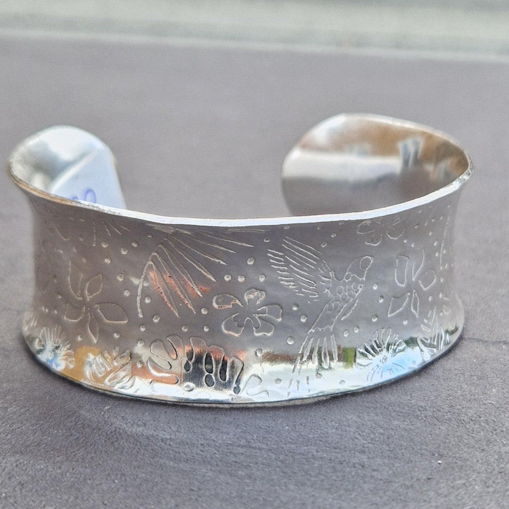 I have embossed a piece of sterling silver sheet with a tropical bird and flower design and formed it into an anticlastic cuff bangle.