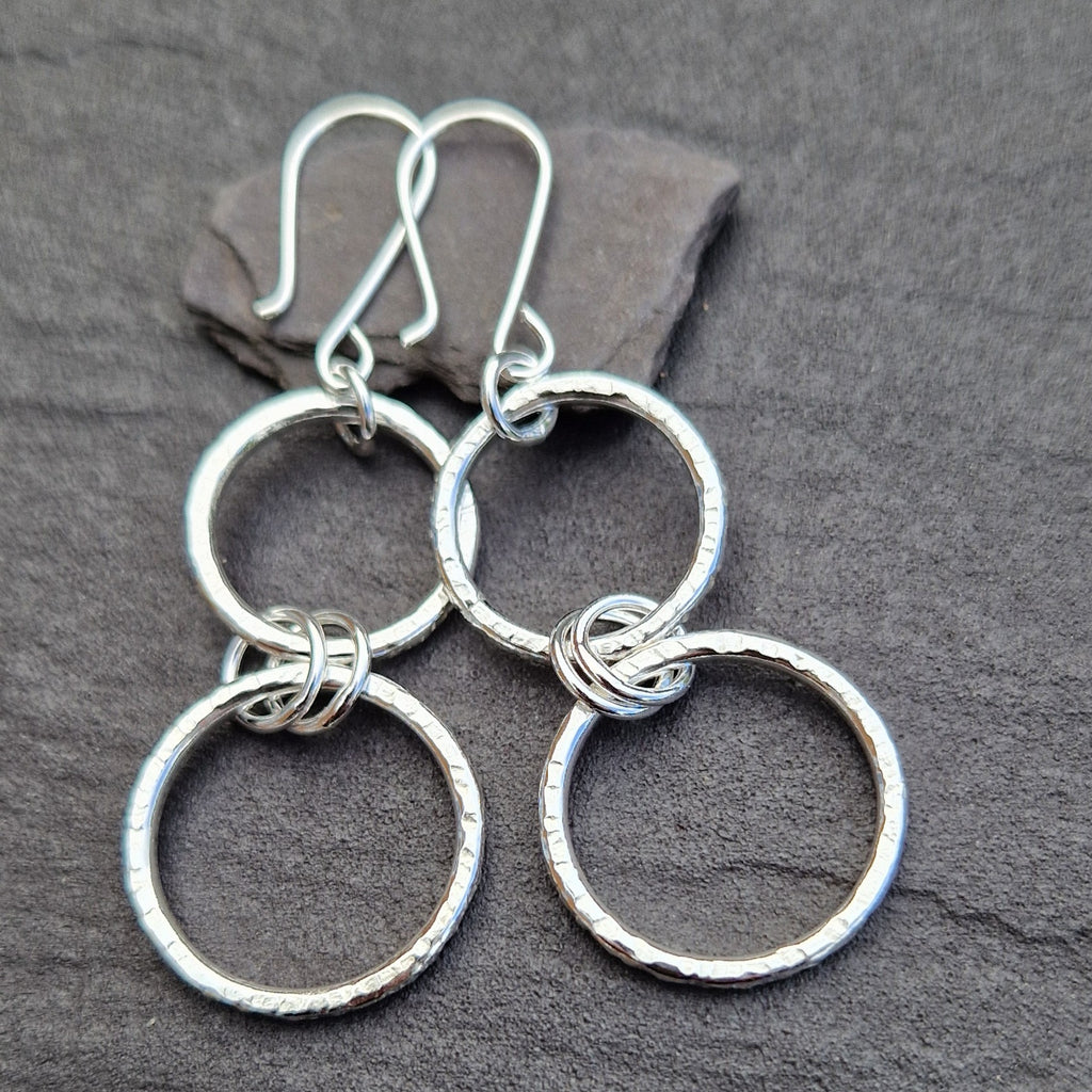 I have created these earrings by forming two rings from sterling silver wire and hammering to add texture and catch the light.