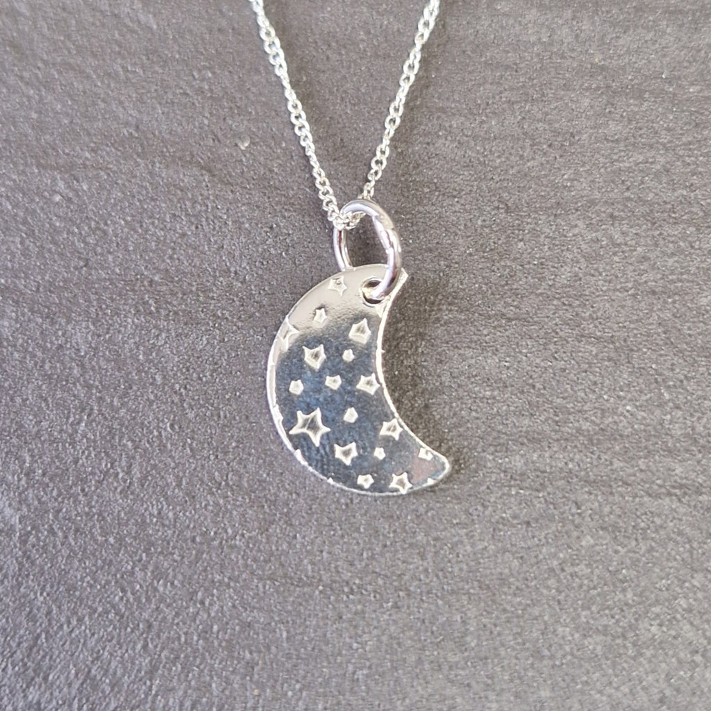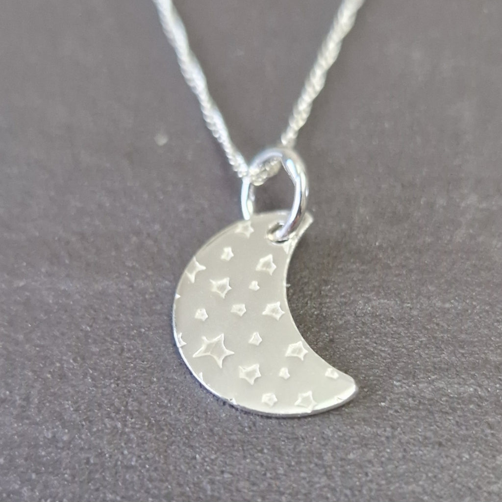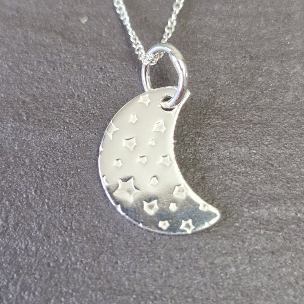 I have created this pendant from sterling silver sheet which I have embossed with a star design and cut into a moon shape.