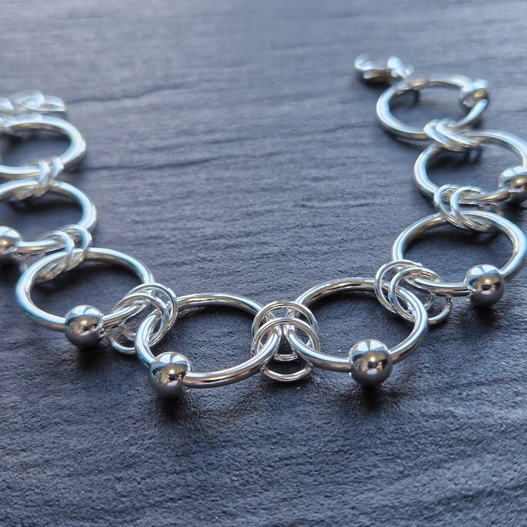 The bracelet is created from eight sterling silver rings that I have formed by hand from 2mm thick sterling silver wire. Once the perfect ring is formed I carefully saw it open, slide on a sterling silver bead and resolder and finish.