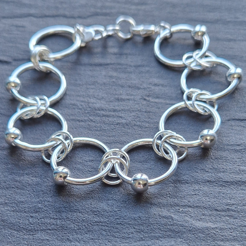 Each ring measures approximately 20mm in diameter and the silver bead moves freely around it. The bracelet is secured with a sterling silver lobster clasp and will fit up to 7.5" wrist.